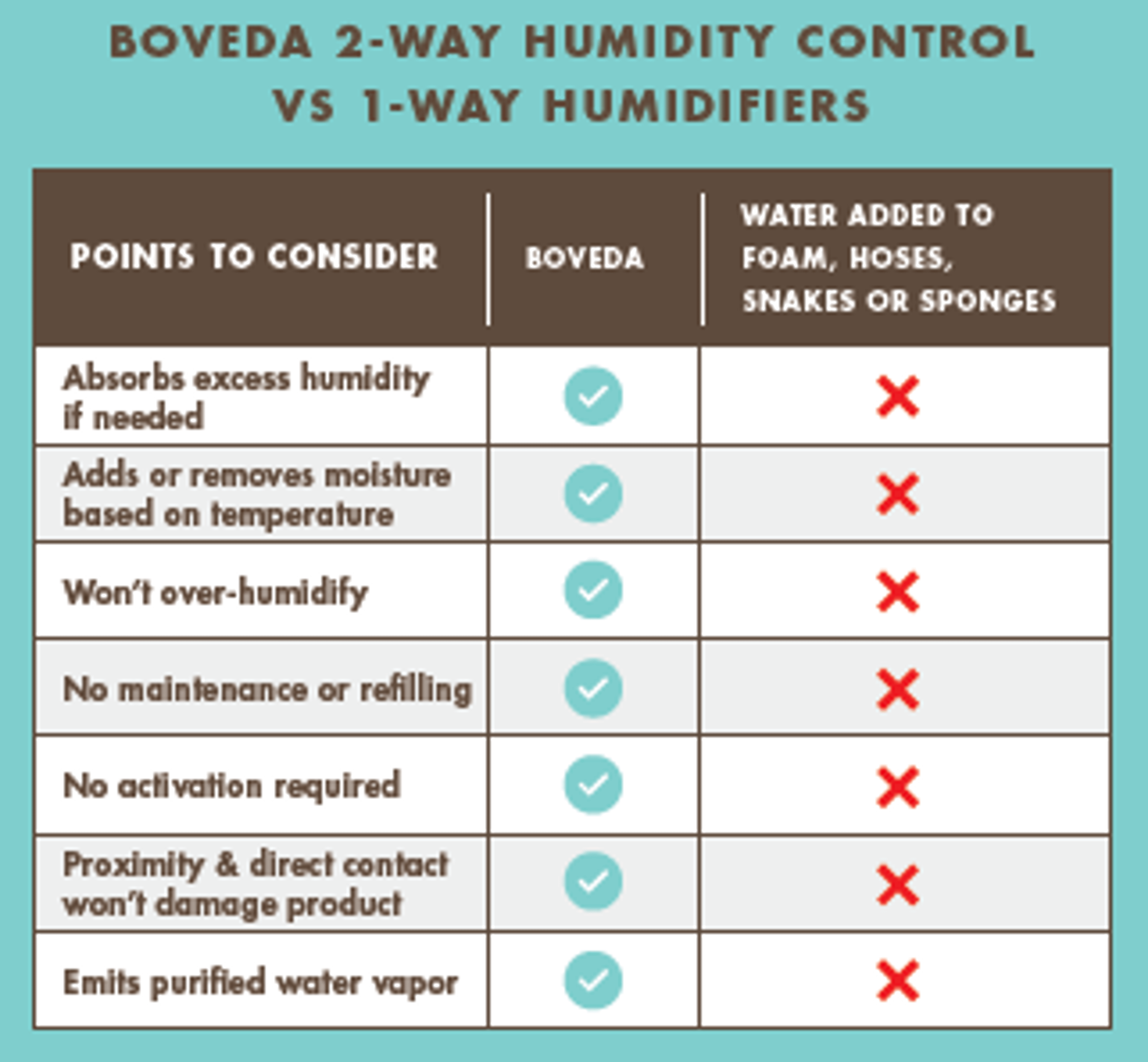 No more adding water to sponges, hoses, or discs. No more risk of moisture puddling inside your instrument. Boveda eliminates the hassle (and danger) of one-way humidification methods. These methods spike humidity when you add water, and take a nosedive as the water evaporates.