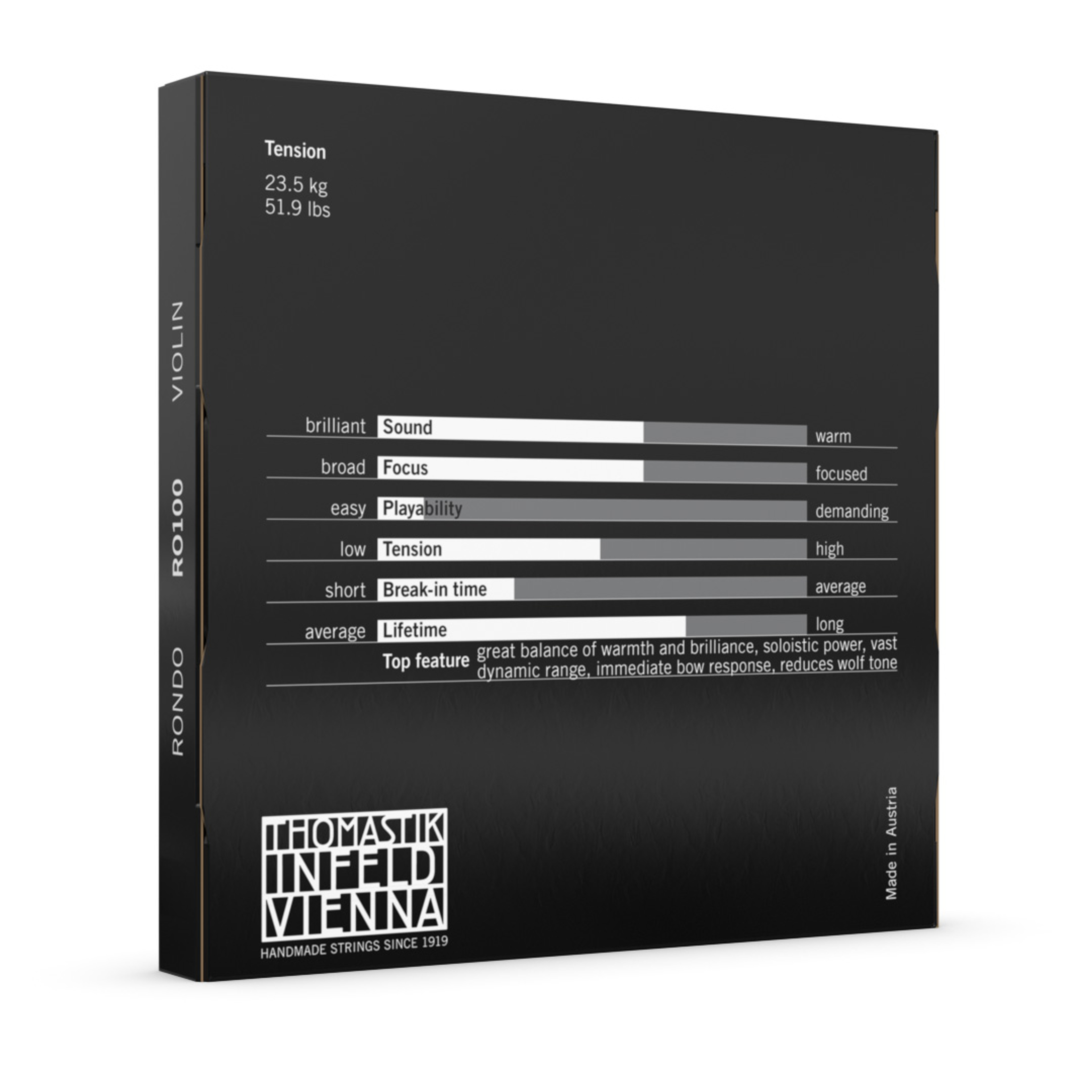 Rondo strings are popular among soloists. The RO100 set comes with a synthetic core, aluminum wound A-string, providing great modulation and a rich spectrum of sound colors. For string players looking for a traditional A-string or looking for 100% corrosion resistance and easier playability, Rondo offers a steel A-string without the common downsides of sounding too bright or shrill.